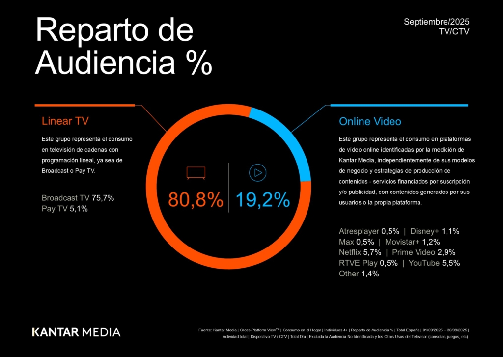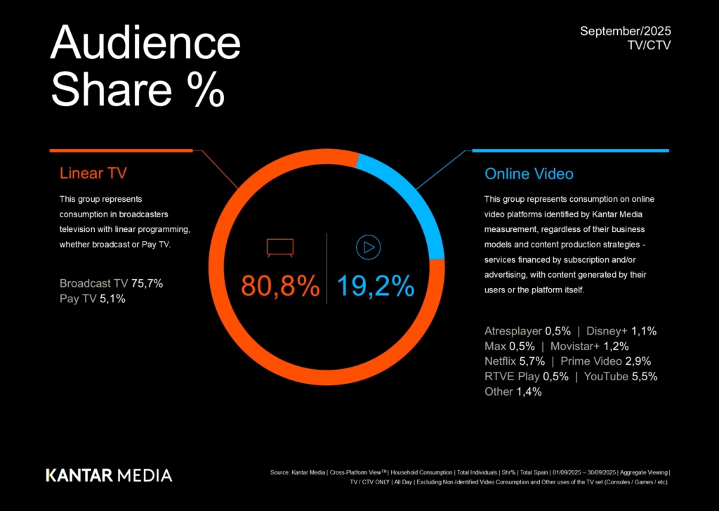 Data from Cross-Platform ViewTM, Kantar Media’s solution that offers a global vision of audiovisual consumption through unified metrics, shows the audience share (%) during September 2025 on TV sets in Spanish households.